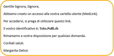 Quando un Spitex crea degli accessi per i suoi pazienti o per uno dei suoi terzi, questi ricevono una e-mail contenente i dati di accesso, come il nome utente e il link che permette di effettuare la connessione. Il contenuto di questa e-mail è stato rivisto per rendere più leggibili i dati richiesti per la connessione. Per ragioni di sicurezza, la password non è menzionata in questa e-mail. Come prima, la password viene inviata al paziente o a terzi tramite un SMS separato.