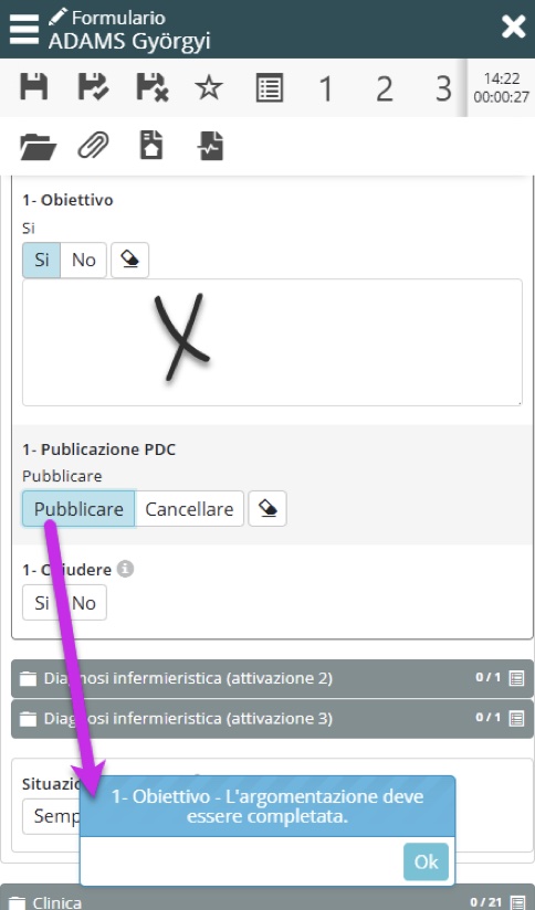 Le risposte positive alle voci “Legato a”, “Caratterizzata da” e “Obiettivo” devono essere accompagnate dalla documentazione. In caso contrario, la pubblicazione del Metodo di Risoluzione dei Problemi viene bloccata e viene visualizzato un avviso che indica dove deve essere completata la documentazione.