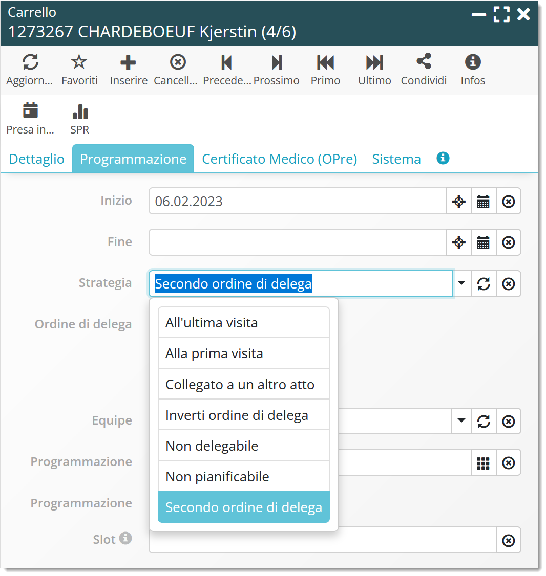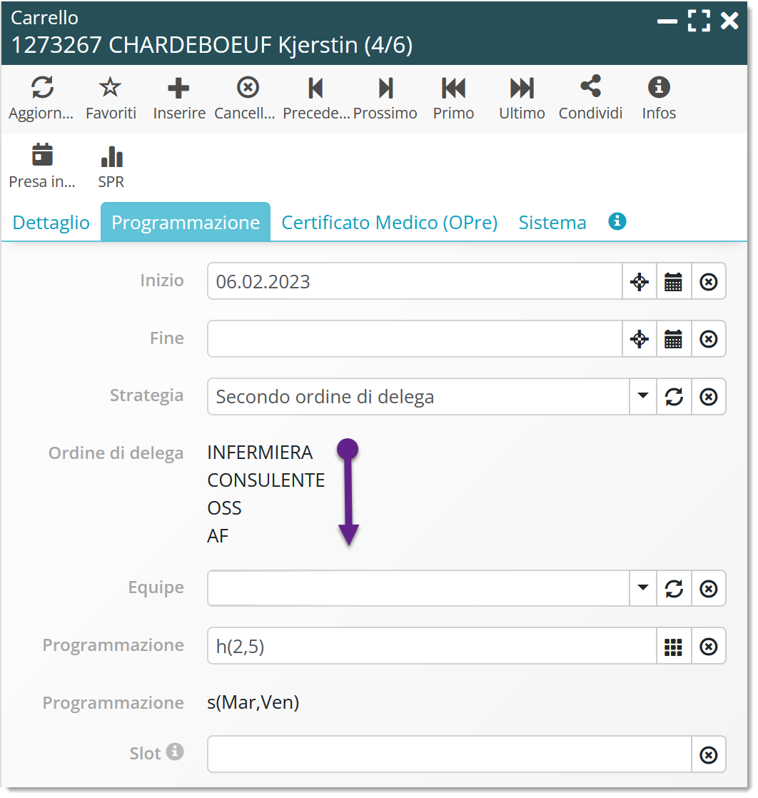- Inverti ordine di delega: l’intervento sarà programmato nella visita del collaboratore con la competenza più bassa nell’ordine di delega. Nel caso di un controllo sanitario, se sono previste visite per un OSS e un AF ma non per un INF, il controllo sanitario sarà assegnato alla visita dell’AF.