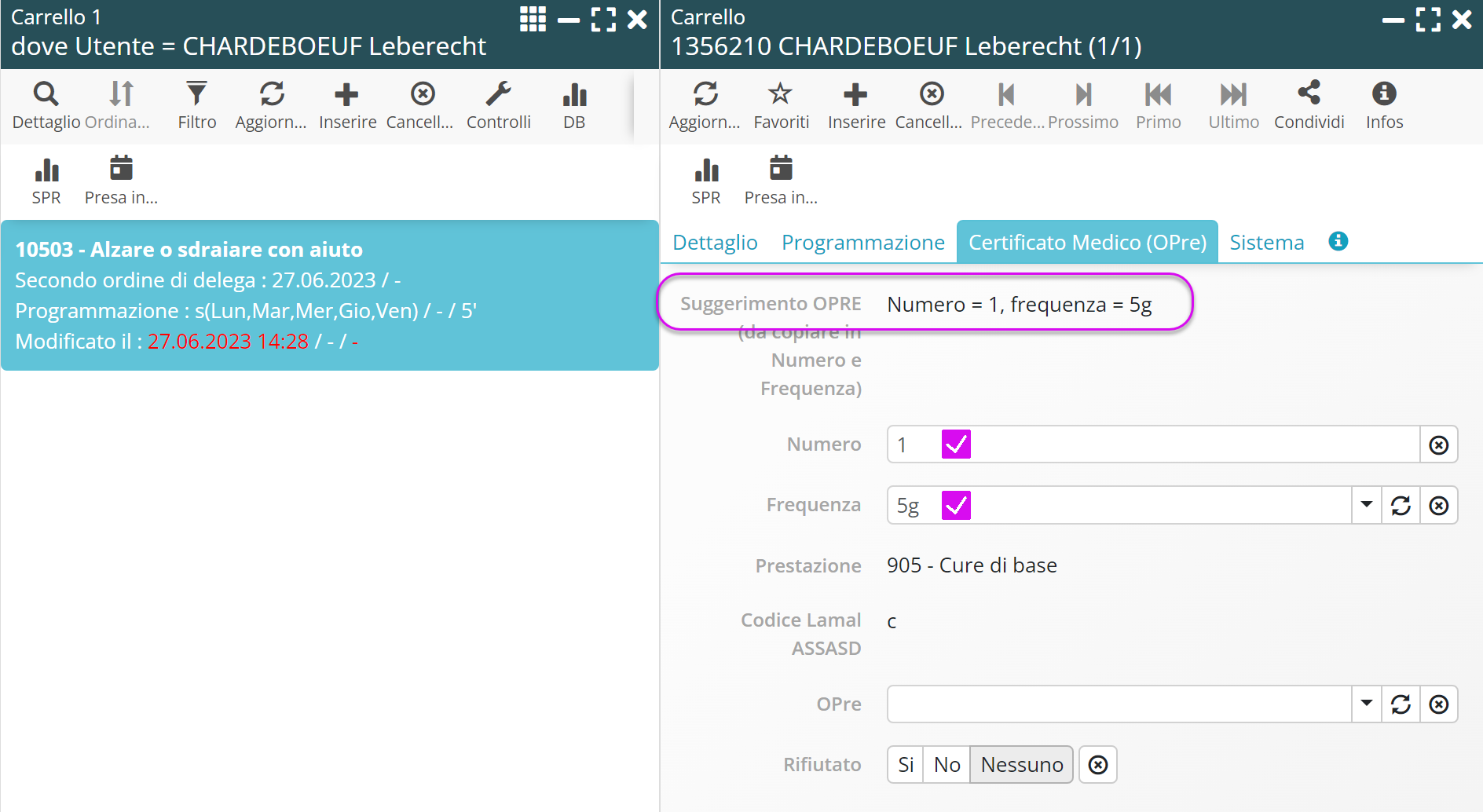 I campi Numero e Frequenza possono ora essere precompilati al momento della programmazione dell’ atto, evitando di dover inserire nuovamente i dati quando il suggerimento ASSASD corrisponde ai valori utilizzati per il calcolo dell’OPre.