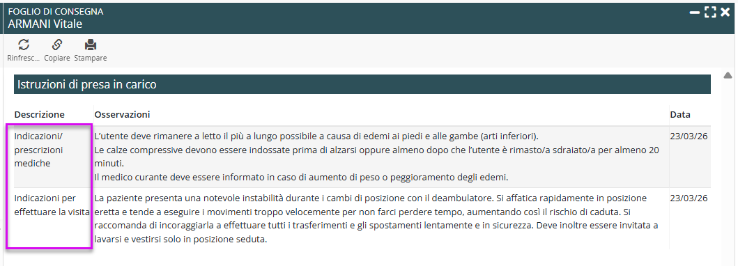 Il rapporto Piano giornaliero integra due sezioni di informazioni essenziali provenienti dal modulo : l’istruzione medica, redatta dal medico o dallo specialista, e la raccomandazione generale per la presa in carico, destinata all’insieme degli operatori. Questi due campi forniscono istruzioni trasversali che orientano il quotidiano dell’accompagnamento del paziente.