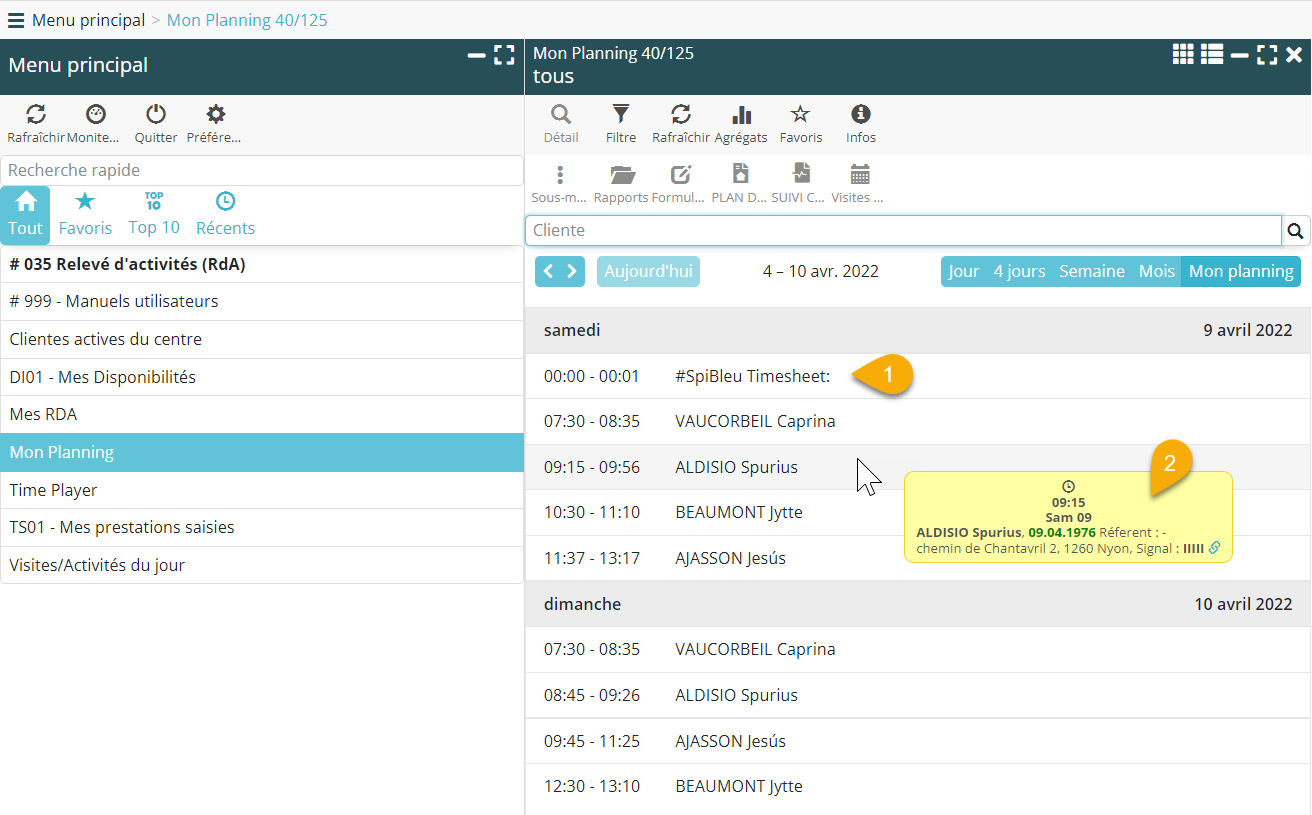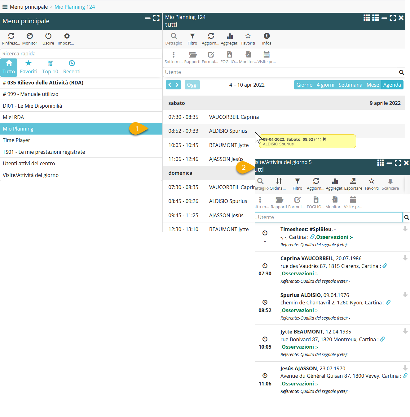 Per conoscere il percorso d’accesso, il referente del cliente, la forza del segnale di ricezione, era necessario passare da `Mio Planning´ a `Visite/Attività del giorno´. D’ora in poi, queste informazioni sono raccolte in una finestra popup (punto n°2) quando si passa sulla visita. Inoltre, abbiamo aggiunto in cima alla lista la linea che permette di inserire attività al di fuori del contesto di un cliente (segno di spunta n°1).