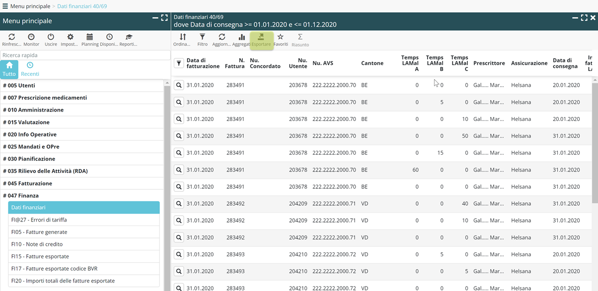 Il menu ‘Dati finanziari’ mostra tutte le fatture che avete esportato: le date delle prestazioni, la loro durata (A,B,C) e gli importi fatturati. Sono inoltre disponibili informazioni supplementari (cantone di residenza, prescrittore, compagnia assicurativa, ecc.) che permettono di effettuare i raggruppamenti richiesti nell’ambito del finanziamento residuo.