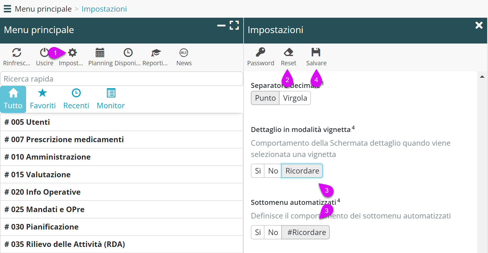 In conclusione, scegliendo nelle impostazioni dell’utilizzatore “Sottomenu automatizzati: Ricordare”, risparmio 3 clic ogni volta che devo consultare le visite programmate di un utente.