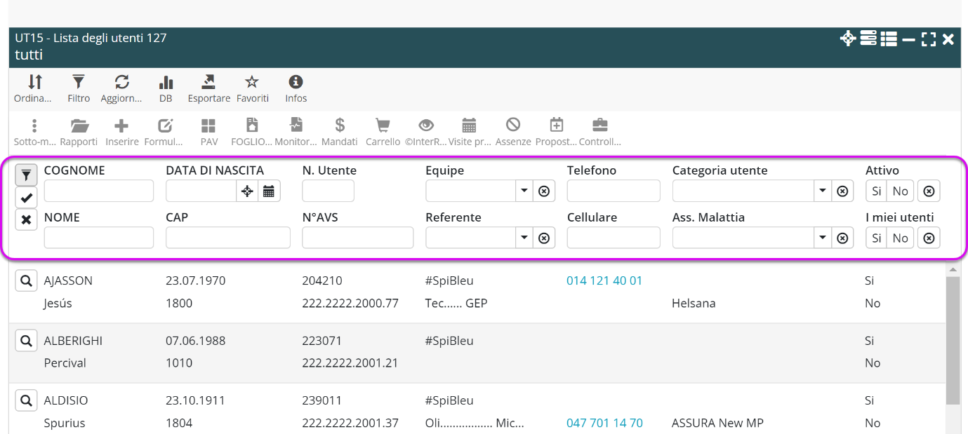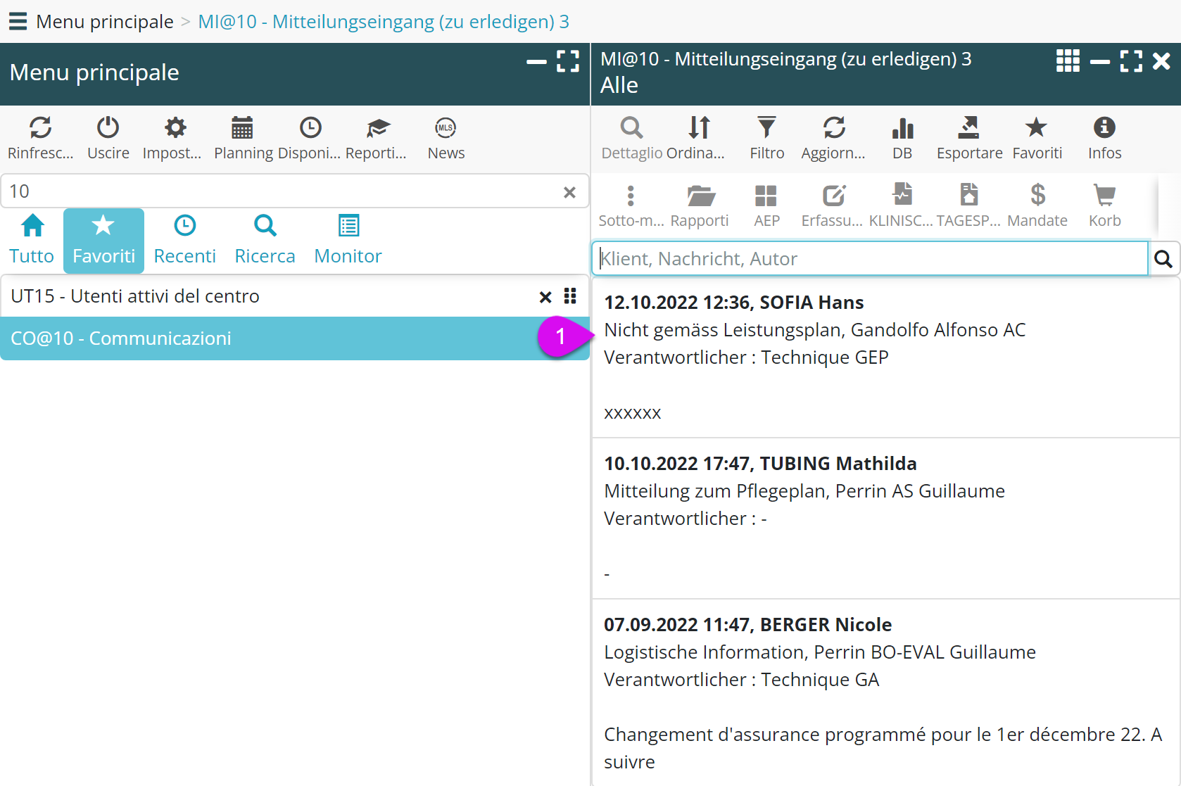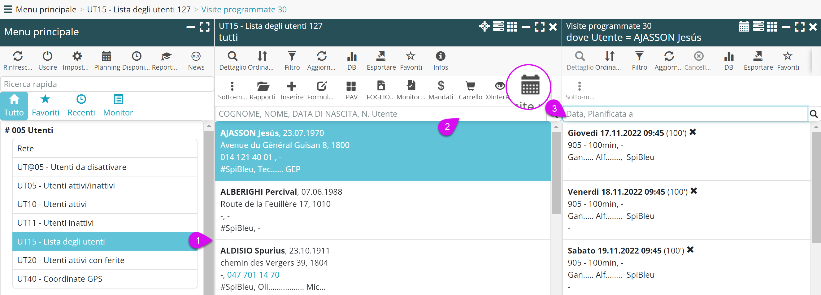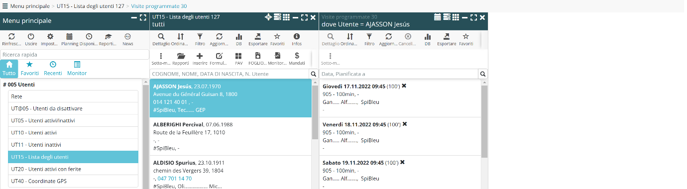 NB: Poiché si è lasciato la UT15 senza chiudere le visite pianificate (= risparmio di 2 clic), la prossima volta che si seleziona un utente dal UT15, le visite pianificate verranno visualizzate automaticamente.