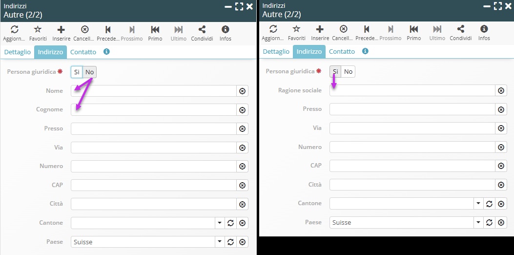 Il campo « Società » è stato cambiato in « Persona giuridica » per eliminare ogni ambiguità..