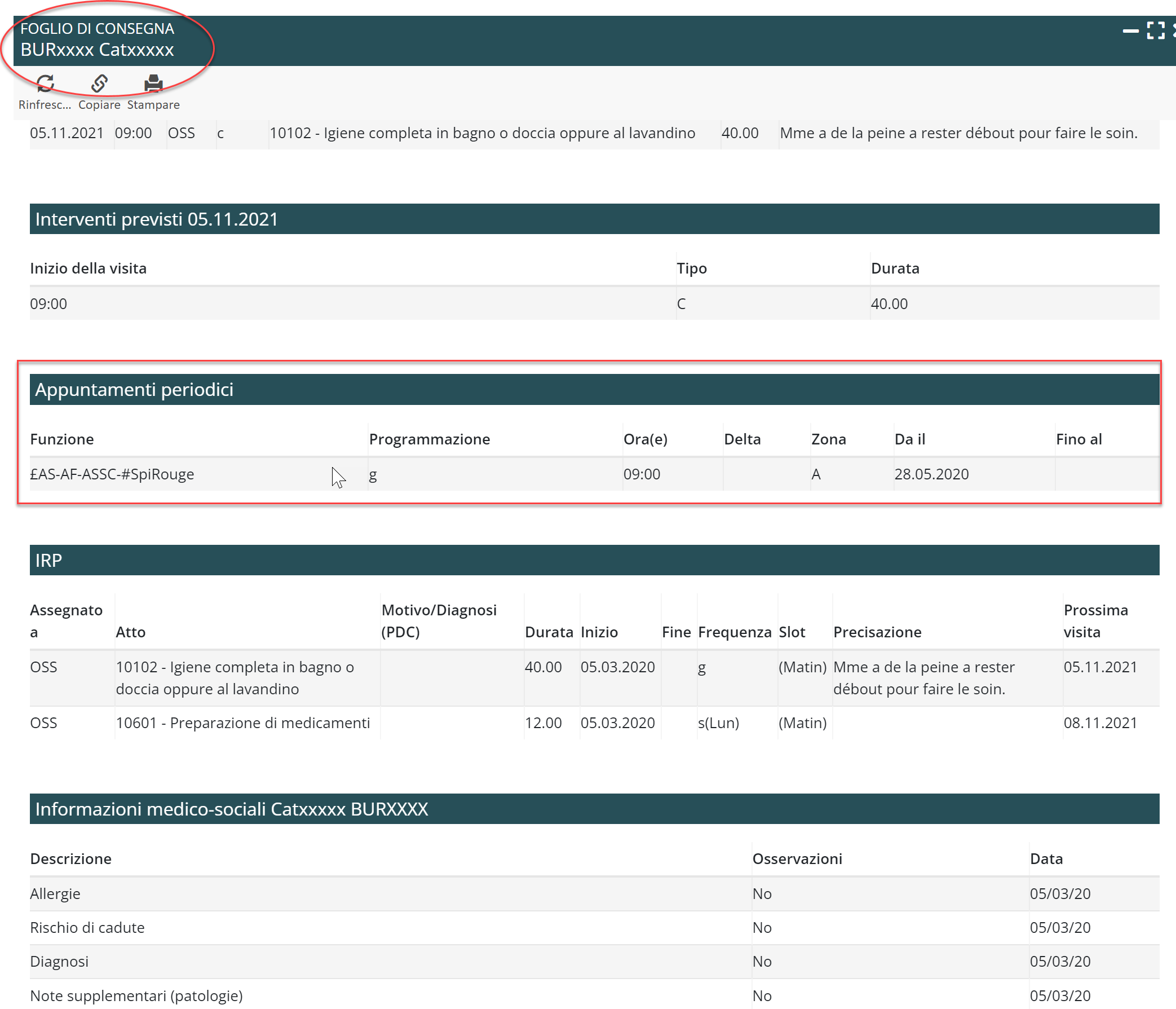 Il foglio di consegna è un documento utile per chi lavora con i vostri clienti. a Riassume le informazioni importanti riguardanti l’intervento. In questo contesto, e per rendere più visibili gli appuntamenti periodici, abbiamo aggiunto una nuova sezione intitolata “Appuntamenti periodici“, posta subito prima della sezione IRP (“Intervento ricorrente programmato”). Mentre quest’ultima fornisce informazioni sulle procedure da eseguire (motivi, particolarità, durata, frequenza, ecc.), la nuova sezione arricchisce il documento con informazioni sull’organizzazione ricorrente delle visite (area, orari e frequenza delle visite, ecc.). Le frequenze (voce “Programmazione”) sono visualizzate in base alla codifica usuale utilizzata in MedLink (cioè g: giornaliera, h: settimanale, m: mensile, ecc.), integrata se necessario da un numero utilizzato per identificare le occorrenze all’interno dell’intervallo scelto. Per esempio, m(1,15) si riferisce al 1° e al 15° giorno del mese e 3(1) si riferisce a una volta ogni tre giorni. Per maggiori dettagli, potete fare riferimento alla documentazione di MedLink.