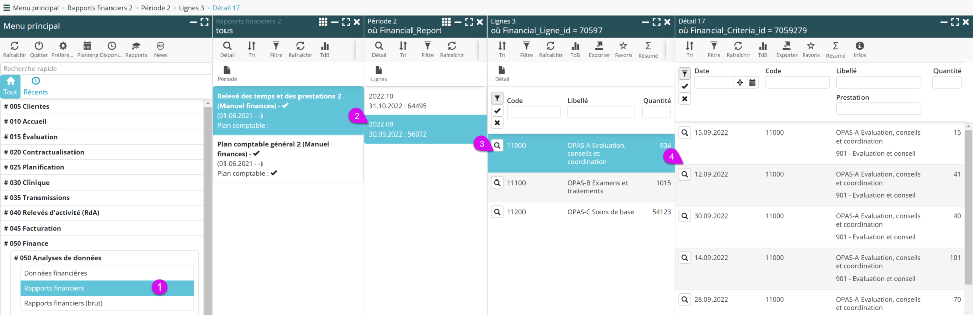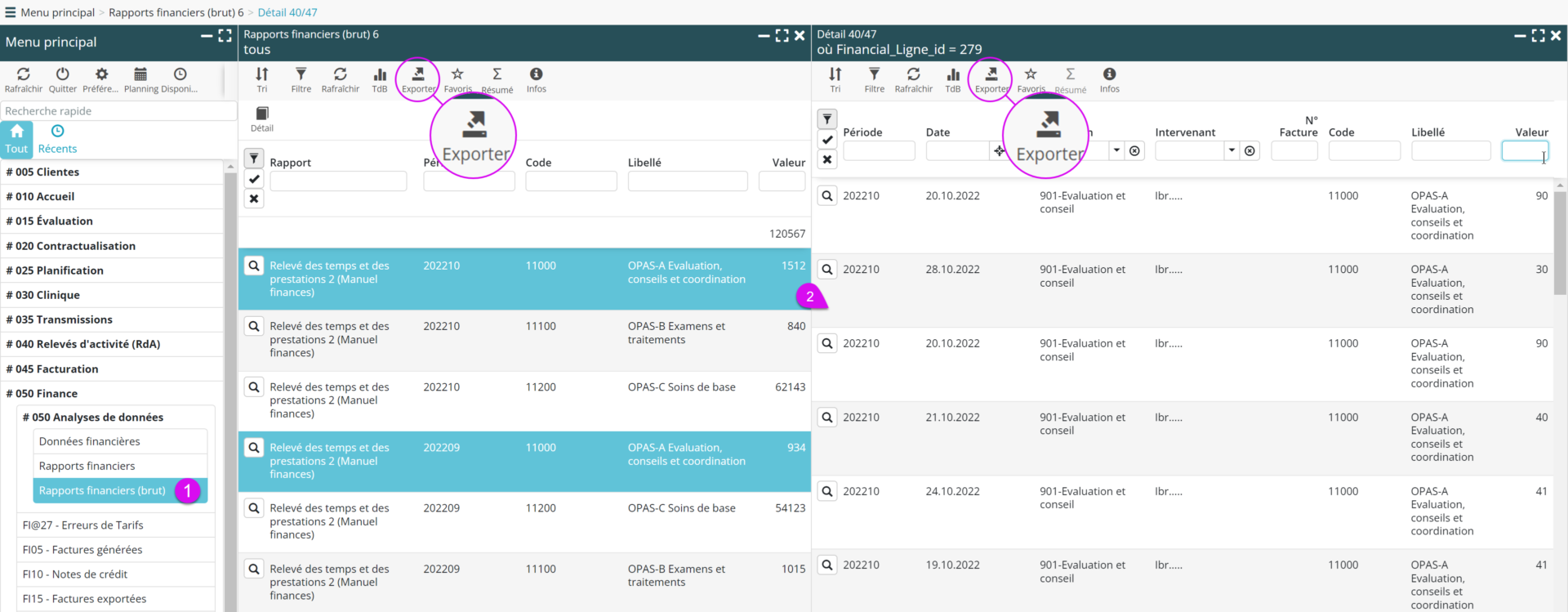Les rapports financiers en ligne permettent de zoomer jusqu’aux lignes de détail des relevés d’activités pris en compte dans le rapport. Chaque niveau de regroupement est exportable.