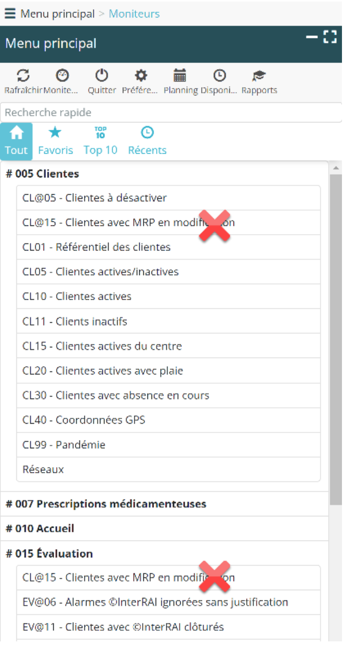 Cette redondance disparait : supprimée des menus # 005 Clientes et conservée dans #015 Evaluation, la liste est renommée EV@01 – Clientes avec MRP en modification.