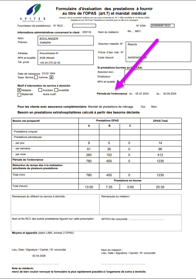 - Période de l’ordonnance (OPAS) → période définie par l’ordonnance médicale (faisant référence à l’OPAS = Ordonnance des prestations)