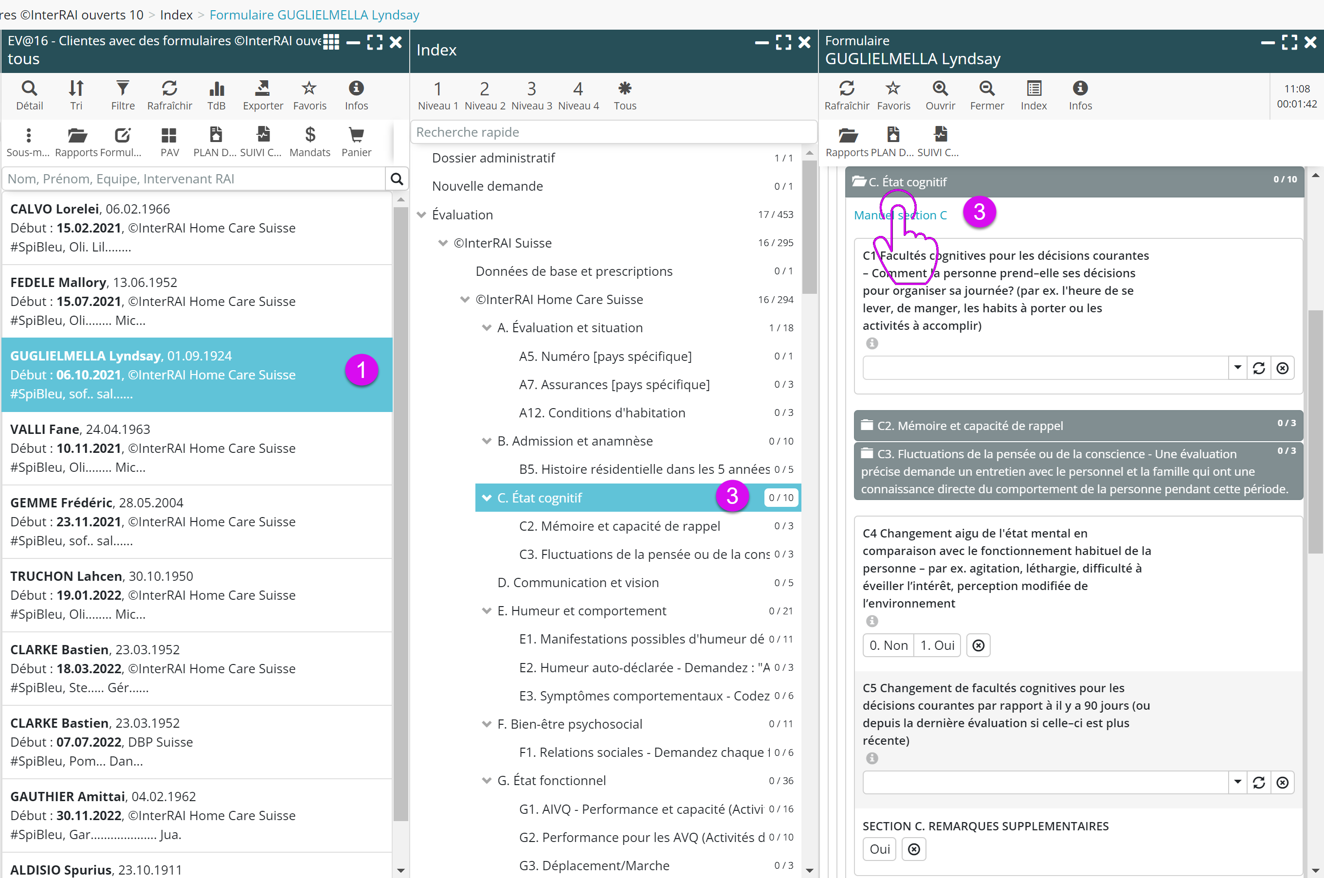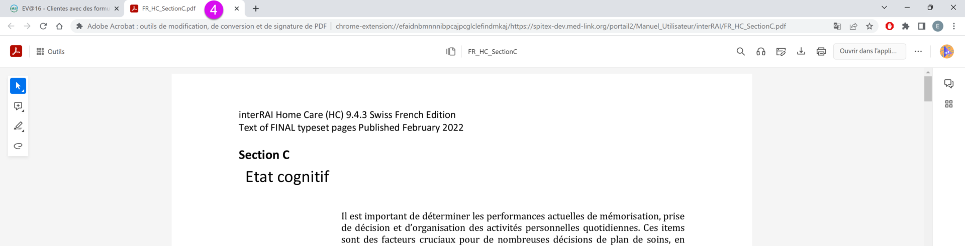 Dans l’exemple ci-dessous, nous illustrons les étapes à suivre pour accéder au manuel de la section C. Etat cognitif de l’InterRAI Home Care Suisse depuis le formulaire du client.