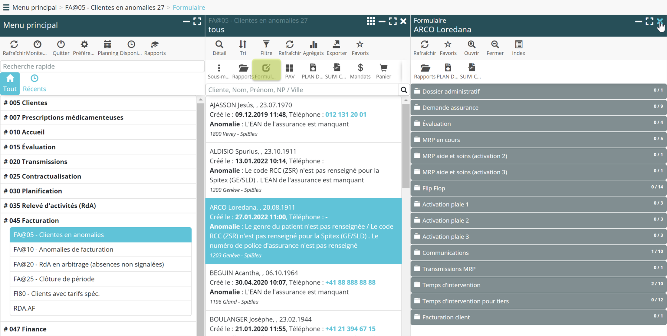 Vous disposez désormais d’un accès direct au dossier du patient depuis FA@05 – Clientes en anomalies. De plus, lorsque vous vous déplacez dans la liste des anomalies, le dossier client ouvert sur la droite s’actualise au fil de votre navigation. De la sorte, vous pouvez corriger les dossiers sans avoir à sortir de la liste des anomalies.
