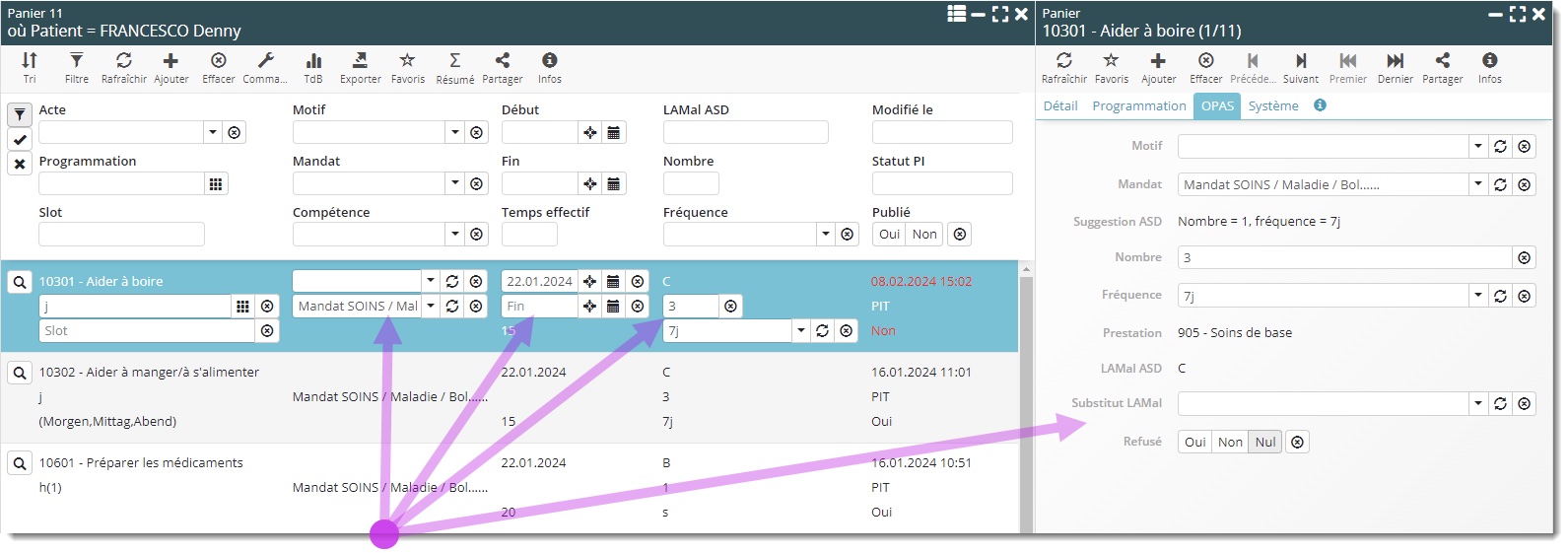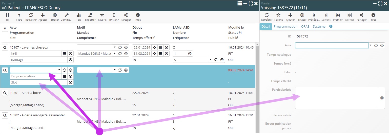 Si besoin, après sauvegarde de l’acte, l’ensemble des champs du panier deviennent modifiables, et notamment :