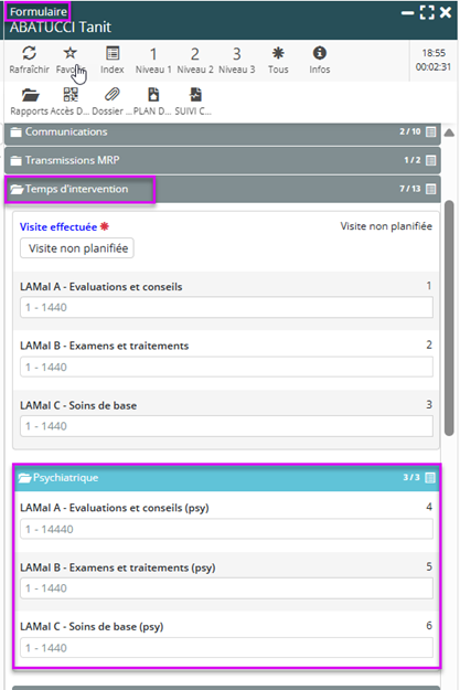 En l’absence d’utilisation du TimePlayer, une nouvelle section « Psychiatrique » est disponible dans la rubrique des temps d’intervention dans le formulaire. Elle permet de saisir le temps d’intervention directement sur le type de prestation approprié.