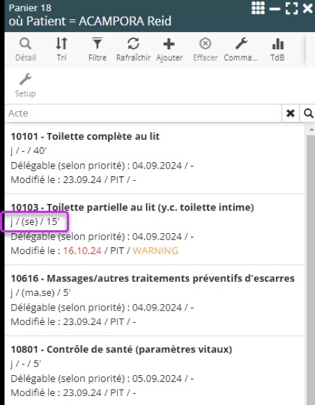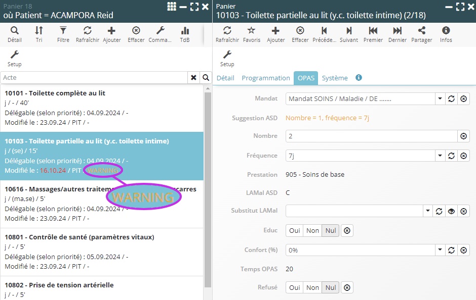 Lorsque la fréquence programmée dans l’OPAS ne correspond plus à celle du panier, un avertissement apparait dans la liste des actes. Dans l’onglet de détail ‘OPAS’ de l’acte, le système suggère les nouvelles valeurs de programmation ASD pour que l’OPAS soit à nouveau en ligne avec le panier.