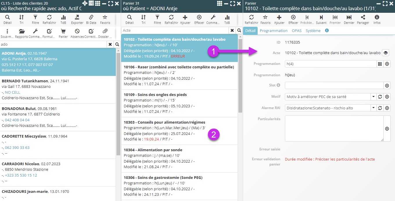- Au moment de la sauvegarde, la liste du panier est automatiquement rafraichie, permettant de voir immédiatement les actes restant à valider et ceux en erreur.