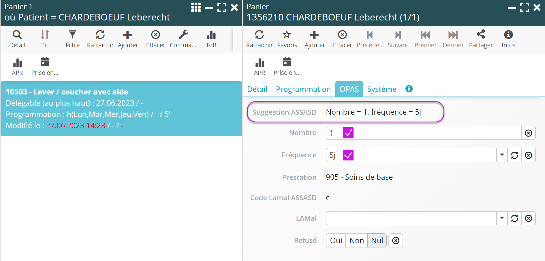 Désormais le Nombre et la Fréquence peuvent se préremplir au moment où la programmation de l’acte, évitant ainsi un travail de ressaisie quand la suggestion ASSASD correspond aux valeurs utilisées pour le calcul de l’OPAS.