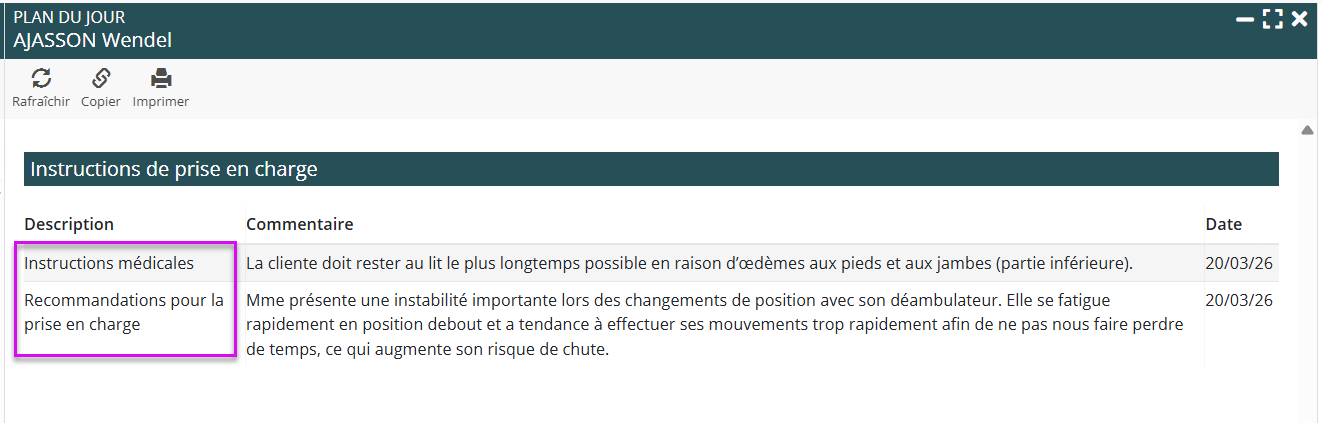 Le rapport Plan du jour intègre deux sections d’informations essentielles issues du formulaire : l’instruction médicale, rédigée par le médecin ou spécialiste et la recommandation générale pour la prise en charge, destinée à l’ensemble des intervenants. Ces deux champs fournissent des consignes transversales qui orientent le quotidien de l’accompagnement du patient.