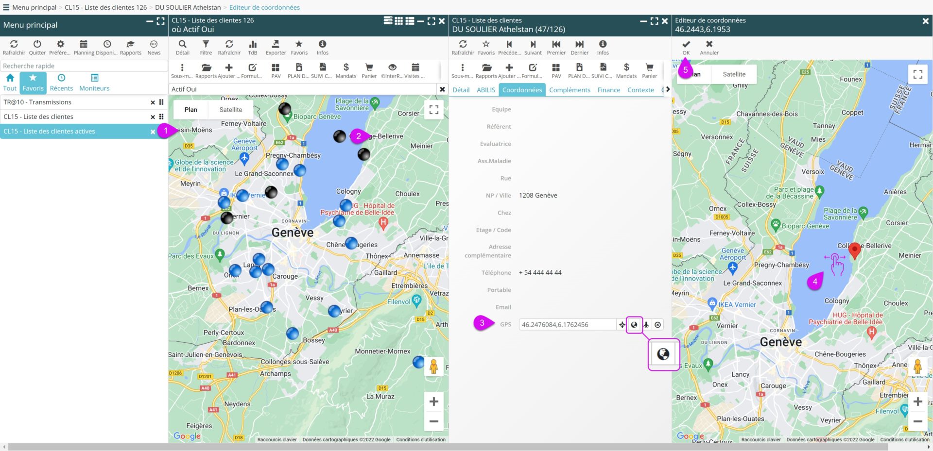 Nous progressons dans cette simplification : à compter du 07 décembre 22, la correction des coordonnées GPS des adresses de prestation pourra se faire également depuis le menu CL15 – Liste des clientes.