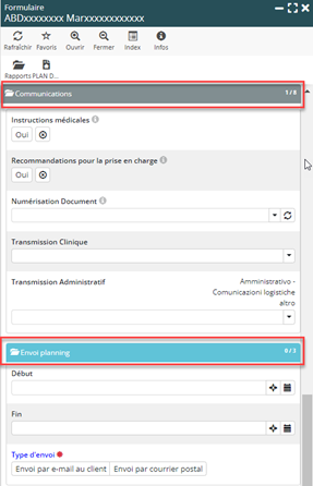 Si avant, la communication de son planning au client s’effectuait sous sa propre entête (« Envoi Planning »), placée au début du formulaire, cette dernière se trouve désormais intégrée dans le chapitre « Communications », à la fin de celui-ci. Cela permet de concentrer en un seul endroit des thématiques liées aux communications et, par conséquent, une vision plus exhaustive de ces dernières.