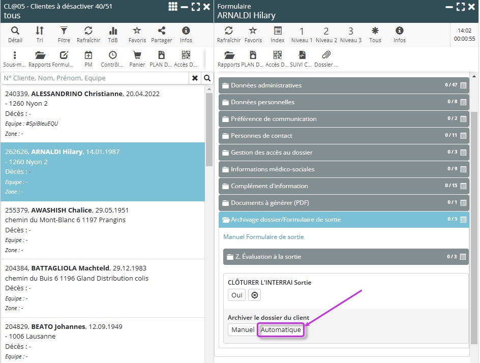 Archivage en un clic : Avec cette fonctionnalité, un utilisateur peut archiver un client inactif en un seul clic. Cela inclut la fermeture des objets liés au client (mandats, actes, PAV, médicaments, etc.), la mise à jour des évaluations de sortie et l’archivage final du dossier.