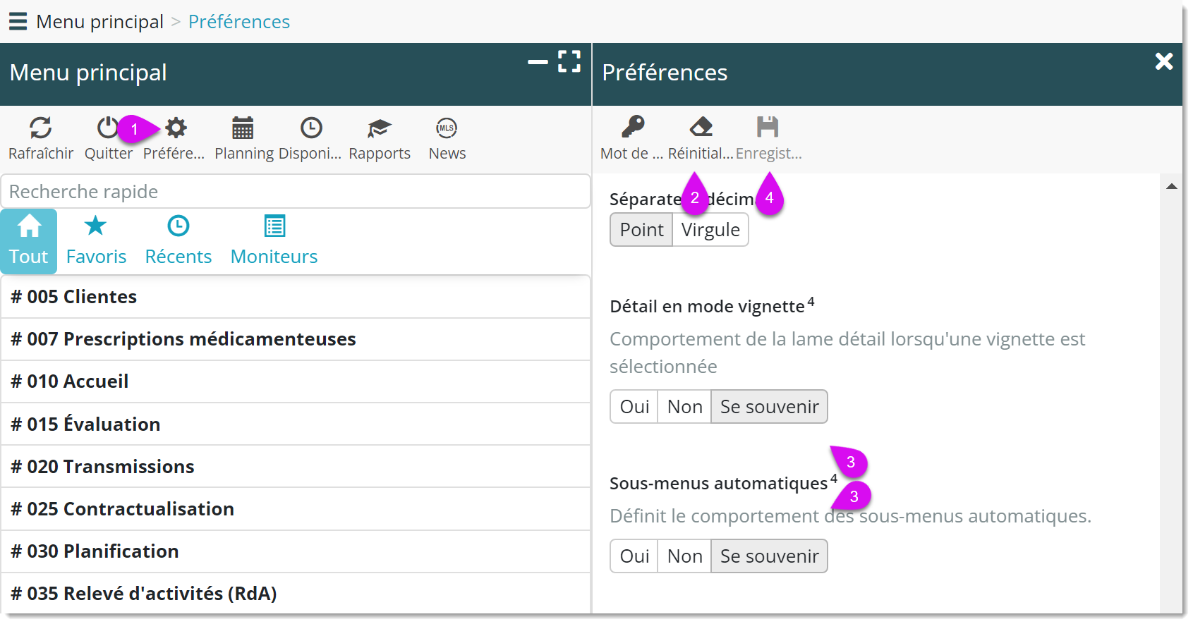 Conclusion, en choisissant dans les préférences utilisateur « Sous-Menus automatiques : Se souvenir », je gagne 3 clicks chaque fois que j’ai besoin de consulter les visites planifiées d’un client.