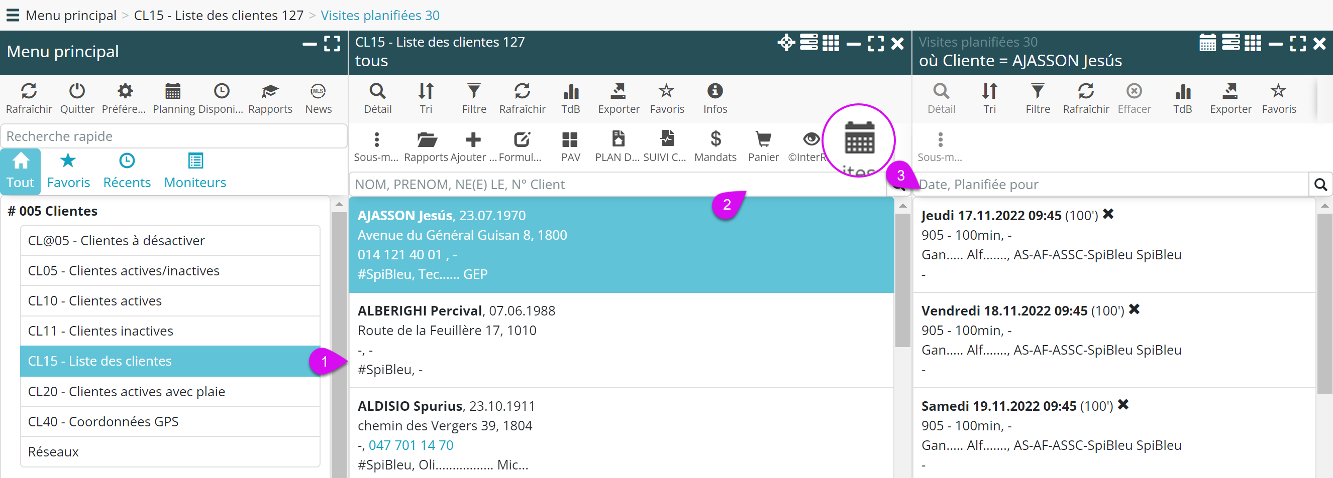 Etape 3 Revenir à la liste des clients CL15 et leurs visites planifiées.