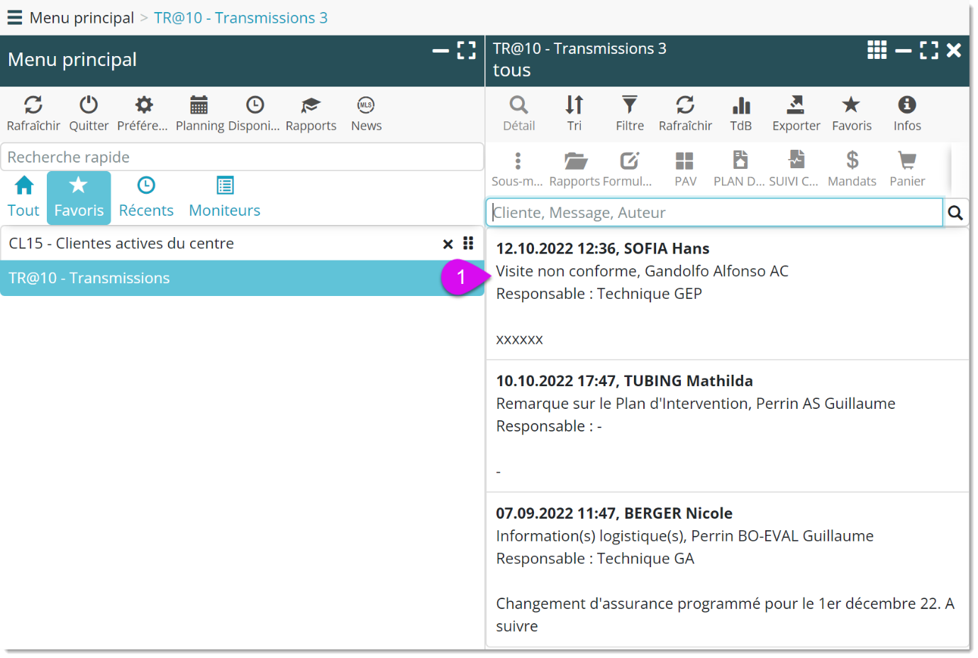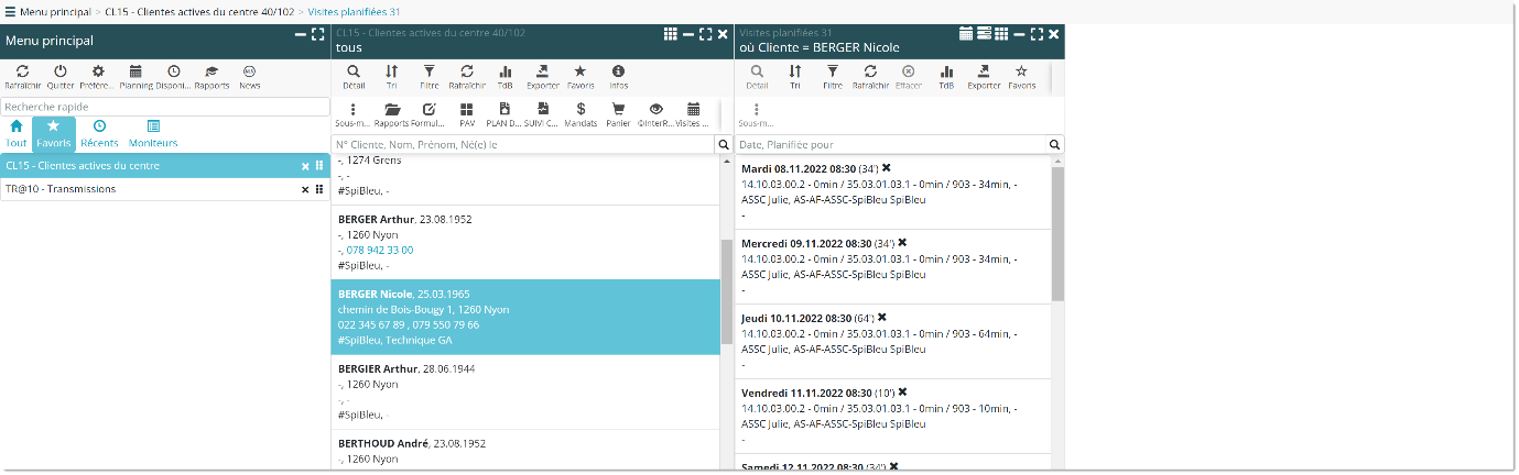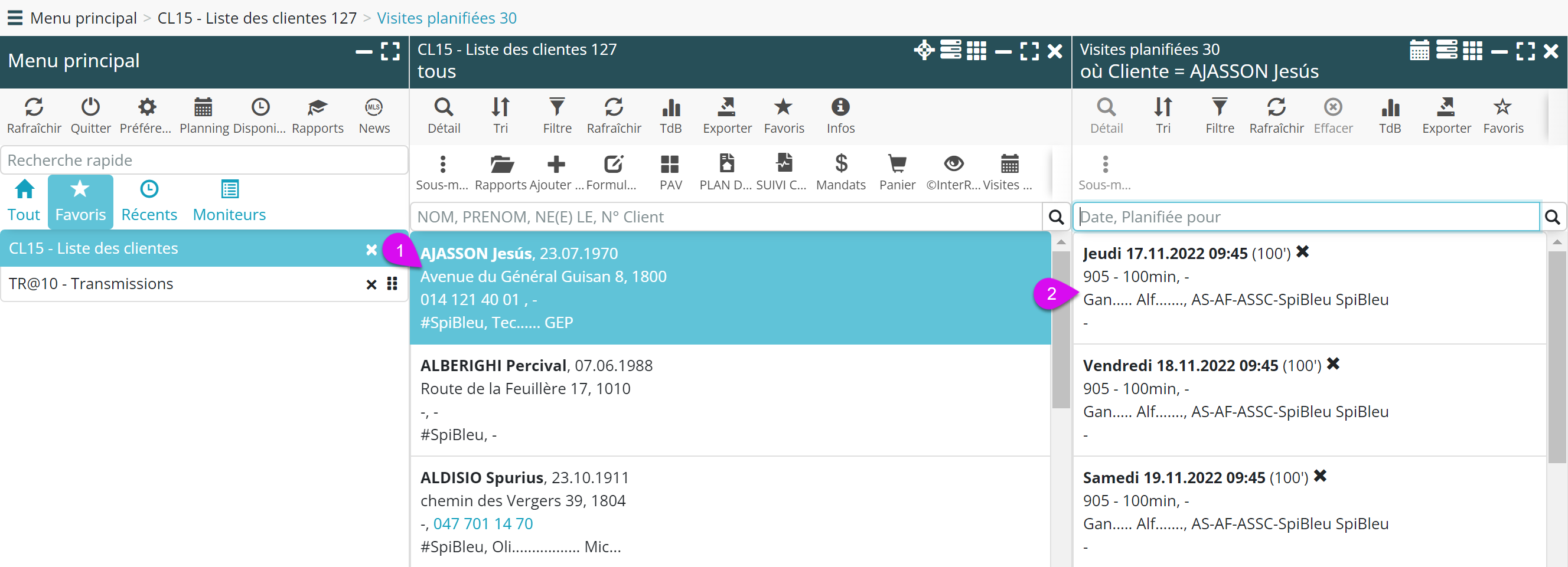 NB : Du fait d’avoir quitté la CL15 sans fermer les visites planifiées ( = gain de 2 clicks), à la prochaine sélection d’un client depuis la CL15, les visites planifiées s’afficheront automatiquement.