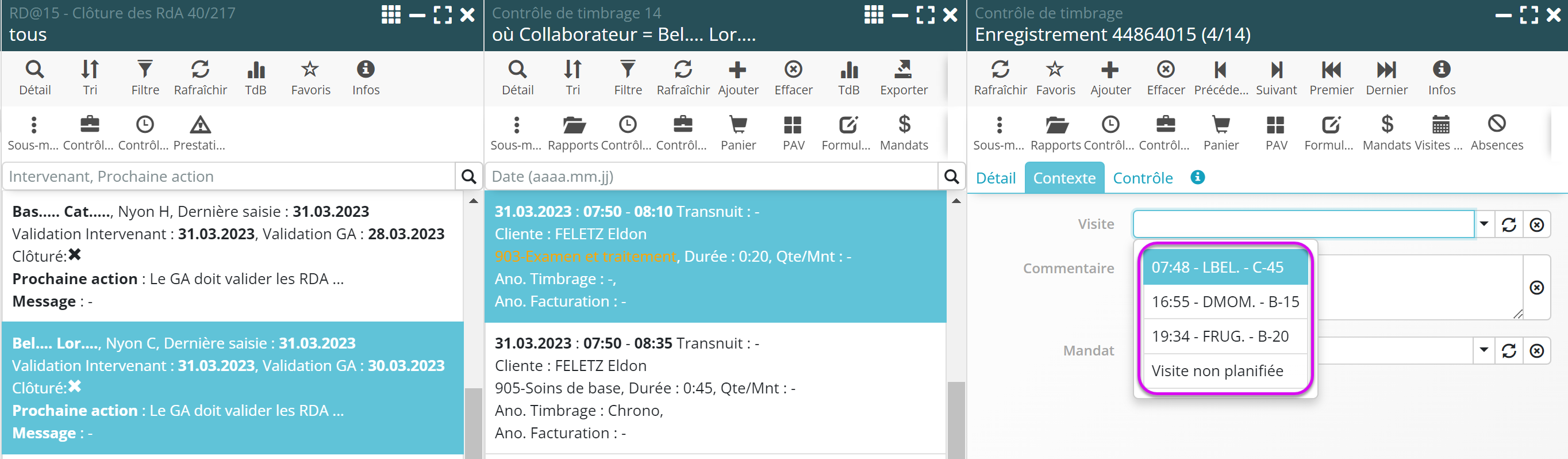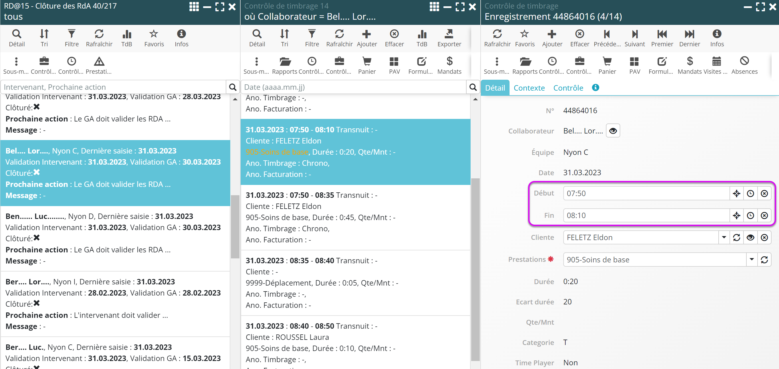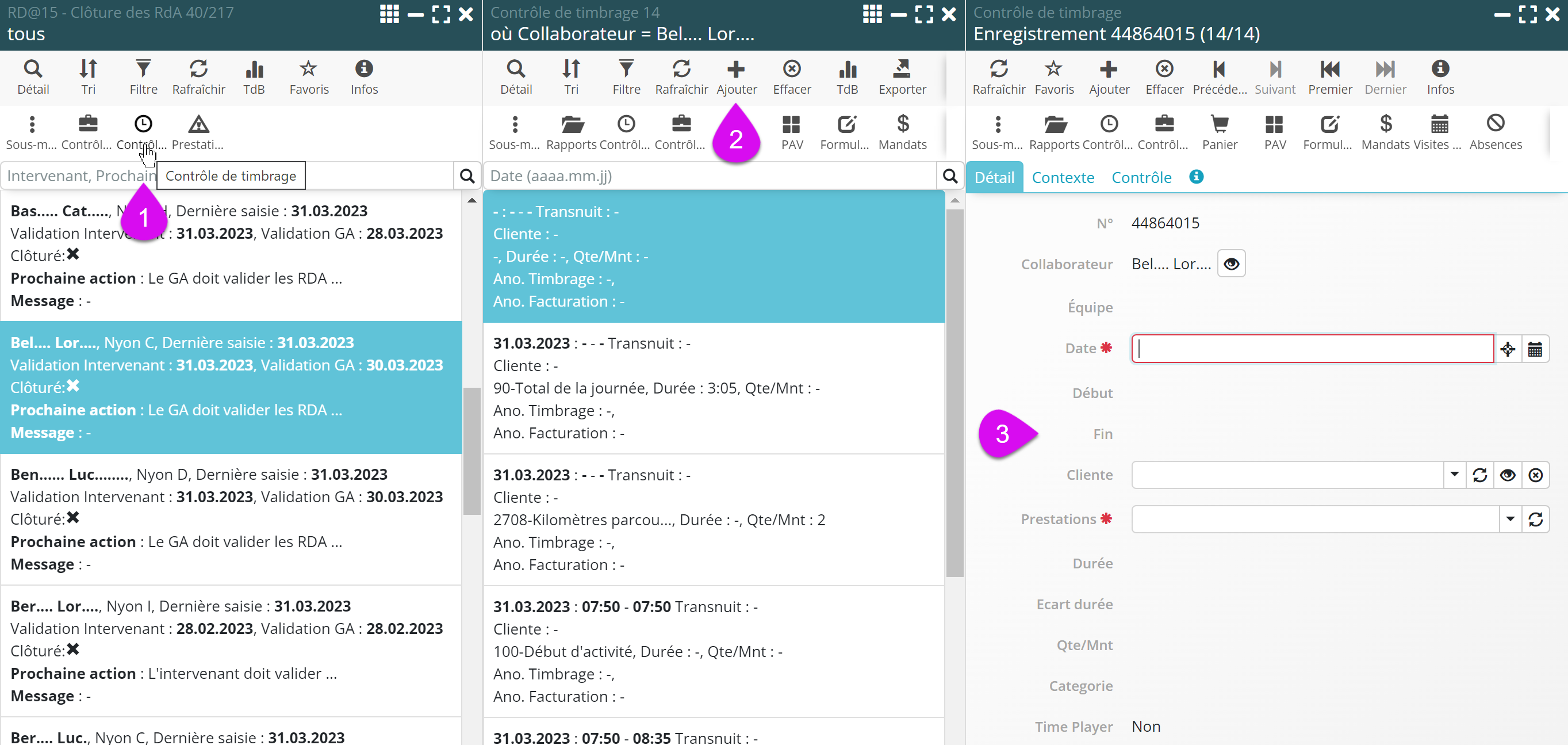 Pour simplifier ce processus, il est désormais possible d’effectuer des ajouts directement dans la liste de Contrôle de Timbrage en sous-menu de l’intervenant, avec l’avantage très appréciable d’avoir une vue globale sur les RDA du collaborateur.