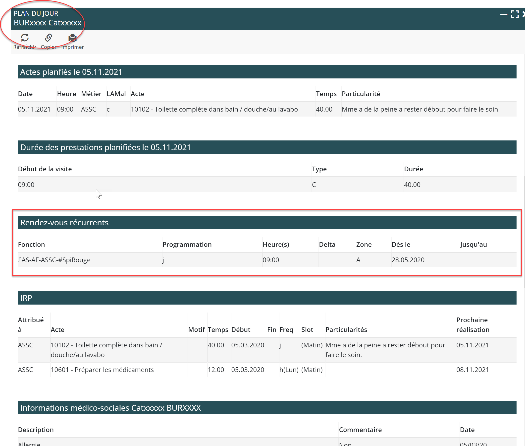 Le plan du jour est un document utile pour les personnes intervenant auprès de vos clients. Il résume en effet les informations pertinentes liées à l’intervention. Dans ce contexte, et dans le but de rendre les rendez-vous récurrents plus visibles, nous y avons ajouté une nouvelle section intitulée « Rendez-vous récurrents », placée juste avant celle des IRP (« Intervention Récurrente Planifiée »). Si cette dernière renseigne l’intervenant sur les actes à prodiguer (motifs, particularités, durées, fréquences, etc.), la nouvelle section enrichie le document avec des informations sur l’organisation récurrente des passages (zone, heures et fréquences des passages, etc.). Les fréquences (en-tête « Programmation ») sont affichées en s’appuyant sur la codification usuelle utilisée dans MedLink (i.e. j : quotidien, h : hebdomadaire, m : mensuel, etc., complété au besoin par un numéro servant à identifier les occurrences à l’intérieur de l’intervalle choisi. Par exemple, m(1,15) désigne les 1er et 15ème jours du mois et 3(1) désigne une fois tous les trois jours. Pour plus de détails, vous pouvez vous référer à la documentation MedLink.