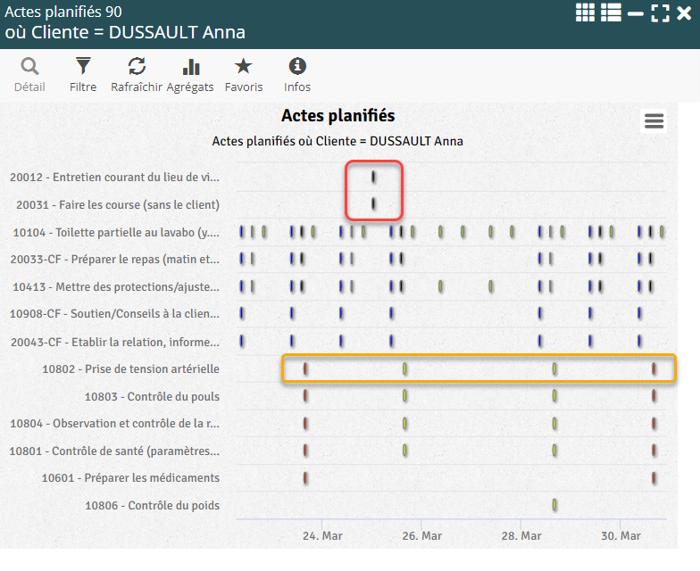Cette présentation permet de repérer aisément les actes délégués. Dans cet exemple, la ligne cerclée en orange montre une délégation partielle d’un acte infirmier à ASSC. Par ailleurs, on repère aisément les actes non planifiés, figurant en noir.