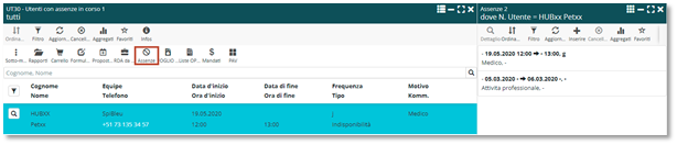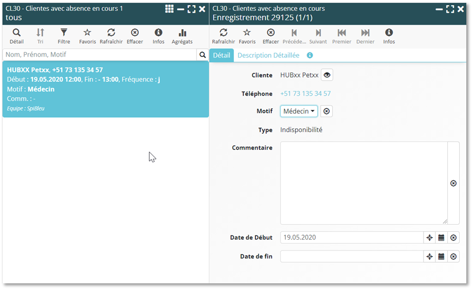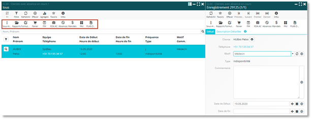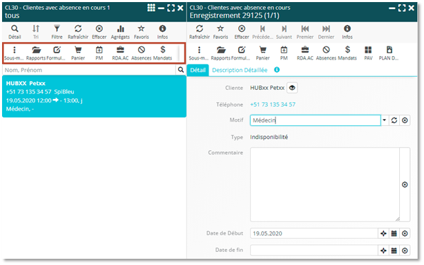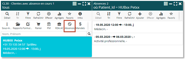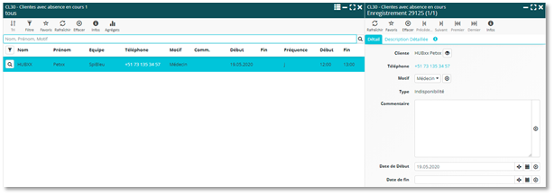 Afin de faciliter l’accès aux informations relatives à un patient, vous avez désormais accès à ses données directement depuis la liste « CL30 – Clientes avec absence en cours », et ceci en mode vignette et en mode tableau. De plus, une nouvelle icône « Absences » a été insérée dans la barre du menu. Elle permet d’accéder plus directement au gestionnaire des absences.